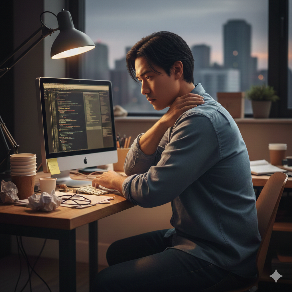 実は、デスクワークによる肩こりの原因は「肩」だけではありません。久山町の当院が、なぜあなたの肩こりが繰り返すのか、その根本的な理由と解決策を解説します。